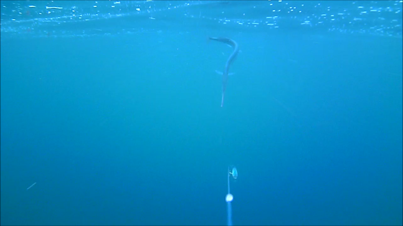 Hice de un tirón al curri , con la cuchara nueva de 65 grs , hasta el cabo de A zambela ... En el recorrido , atacó esta bonita aguja y no pude grabar su ataque submarino...